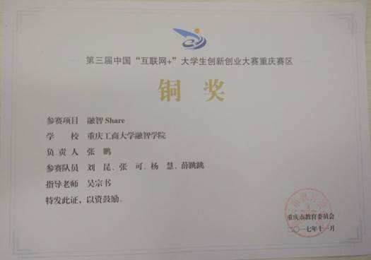 2017年,我校首次参加中国“互联网+”大学生创新创业大赛,学生参与率为5%,“融智Share”等1个项目获得市级铜奖。