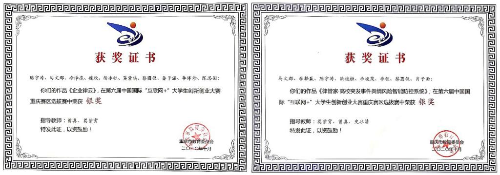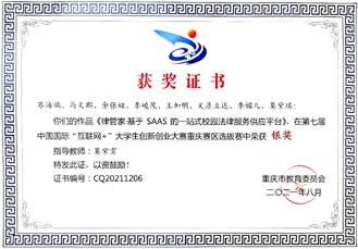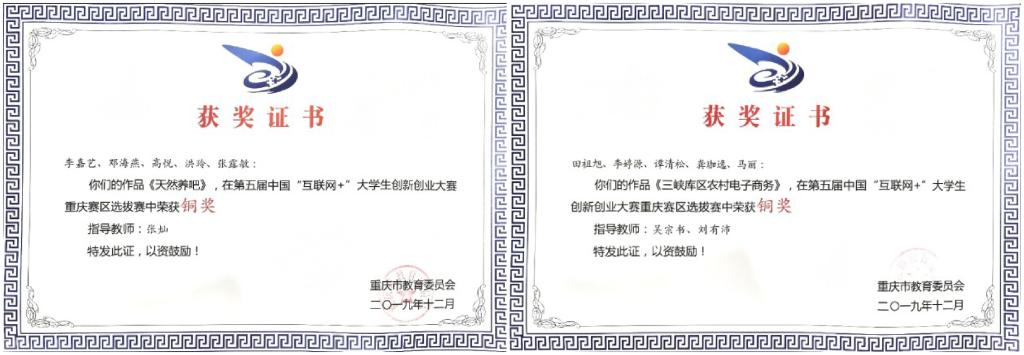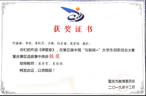 2018年,我校参加第五届中国“互联网+”大学生创新创业大赛,学生参与率为5%,“律管家·高校云端法律援助中心”等1个项目获得市级银奖,“三峡库区农村电子商务”、“天然氧吧”等2个项目获得市级铜奖,这是我校在该项赛事中取得市级银奖“零”的历史性突破。