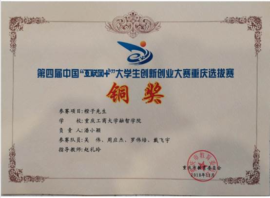 2018年,我校参加第四届中国“互联网+”大学生创新创业大赛,学生参与率为5%,“橙子先生”等1个项目获得市级铜奖。