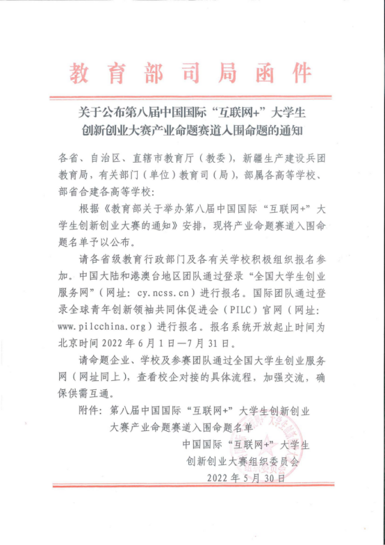 73882必赢欢迎光临网址公布第八届中国国际“互联网+”大学生创新创业大赛产业命题赛道入围命题的通知